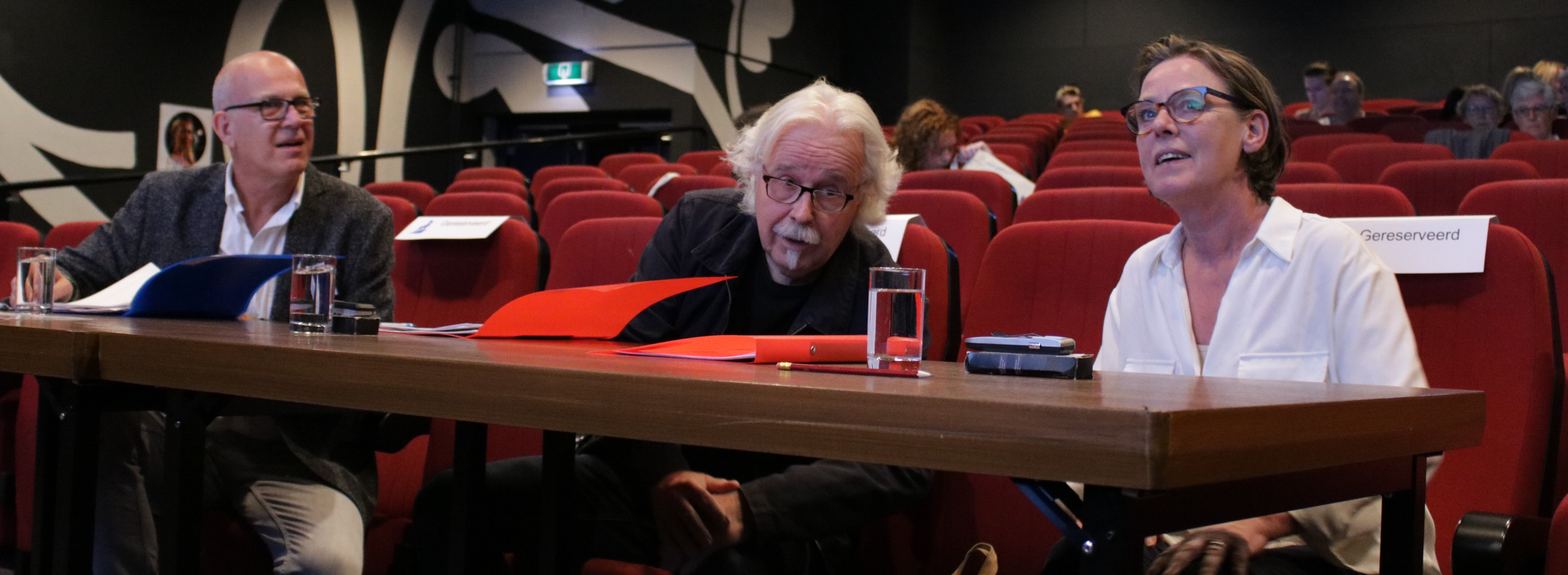 Achter de schermen heeft de jury de nodige informatie gekregen en met hun map en pen lopen Irma van Kampen, Hay Joosten en Jan Elseman de zaal in.